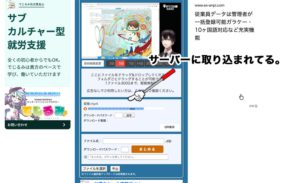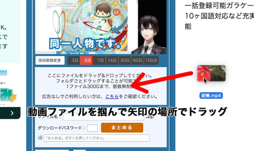 ① 上記サイトを開き、制作した動画ファイルを画面上にドラッグ&ドロップします。